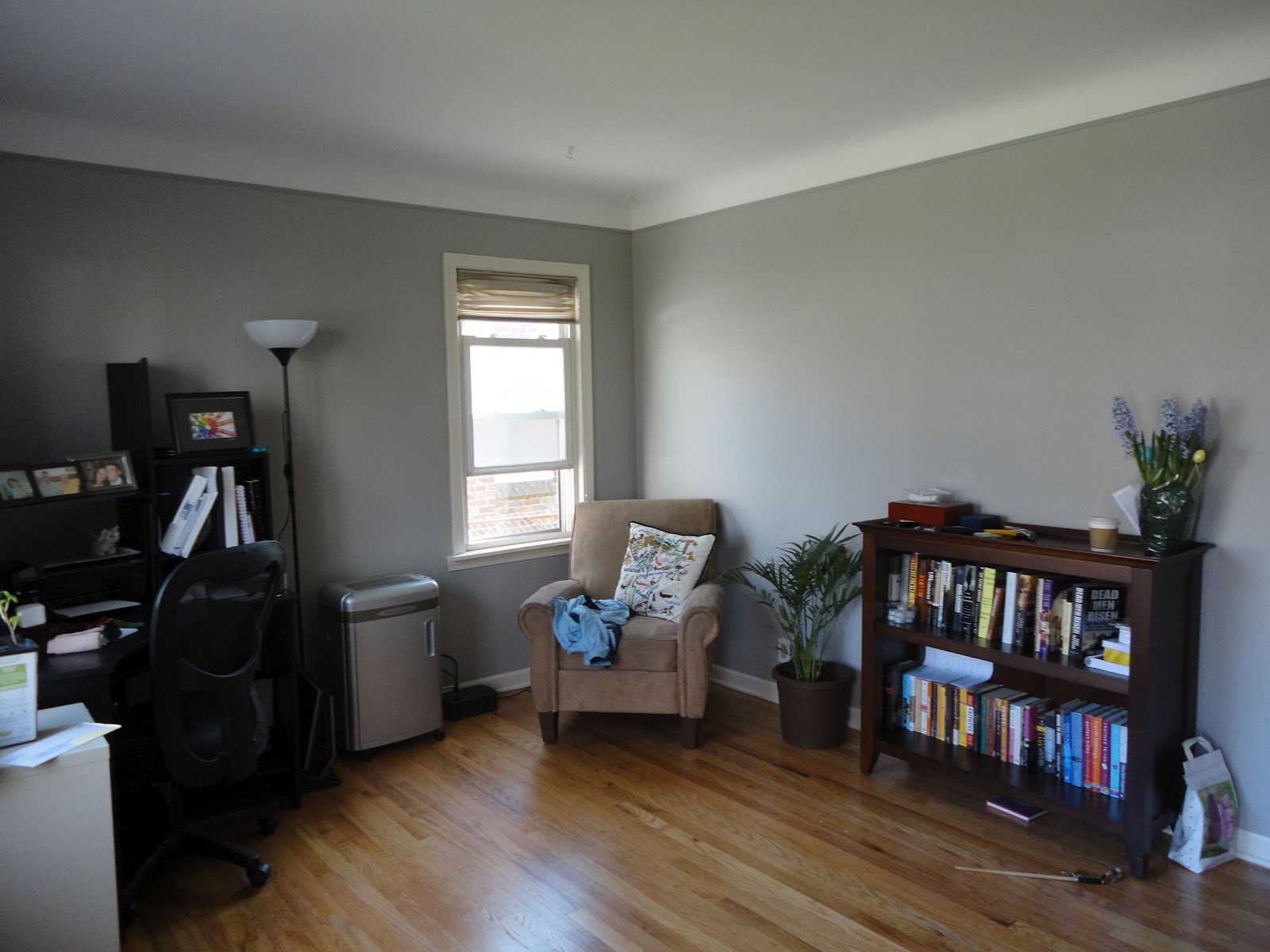 So I painted it grey! The color worked out fantastically! It feels more open and peaceful. I've since hung a few pictures, and may add white drapes later..